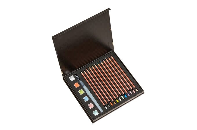 Set bevat 6 verfpannen, 12 potloden en een waterborstel in een presentatiedoos