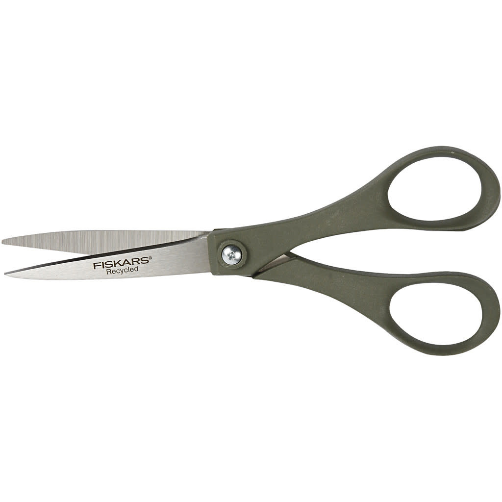 Fiskars algemene schaar met handvaten van 100% recycled plastic.