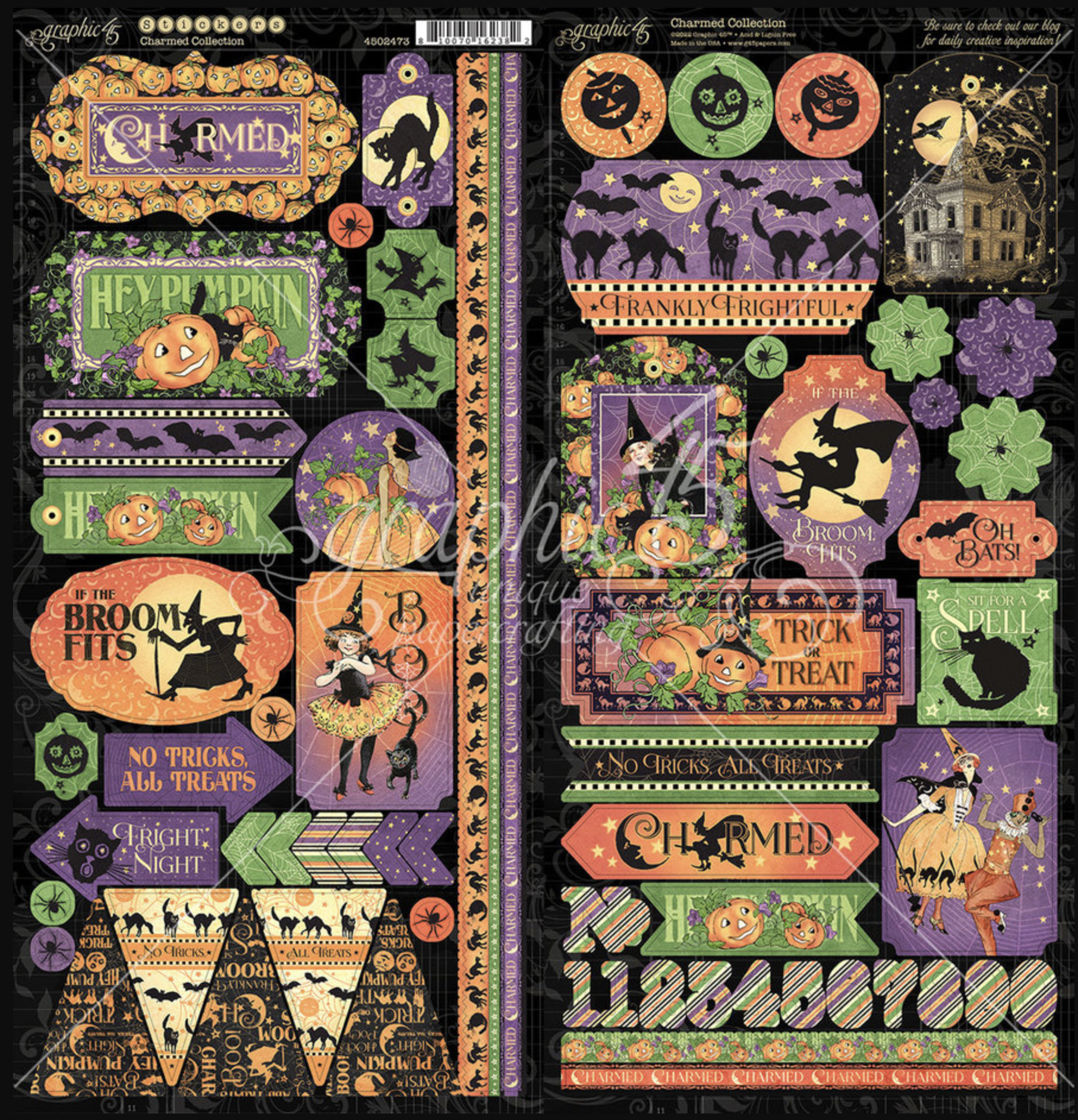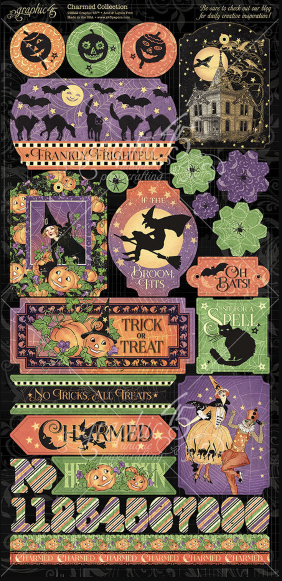 Graphic 45's nieuwe Halloween collectie vol spookachtige spookhuizen, luchtige heksen, zwarte katten en jack o'lanterns.