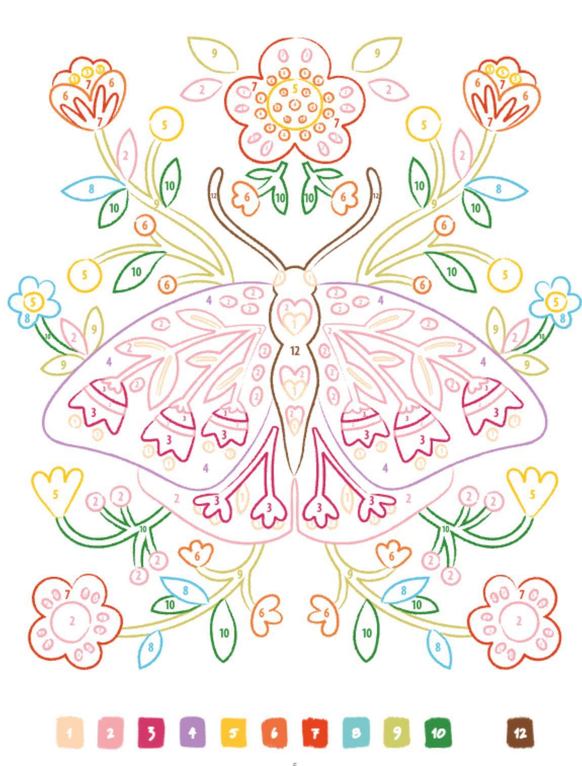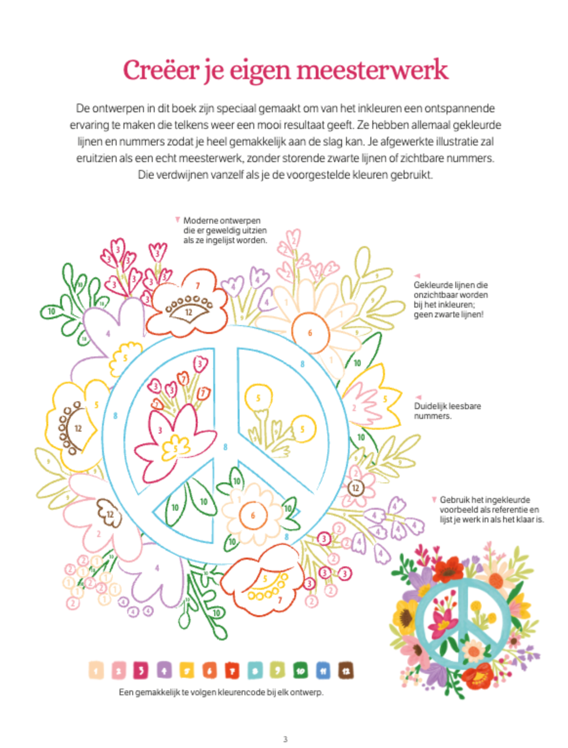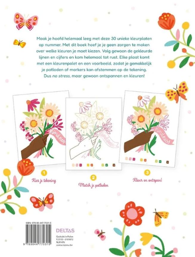 Met dit boek hoef je je geen zorgen te maken over welke kleuren je moet kiezen. Volg gewoon de gekleurde lijnen en cijfers en kom helemaal tot rust.