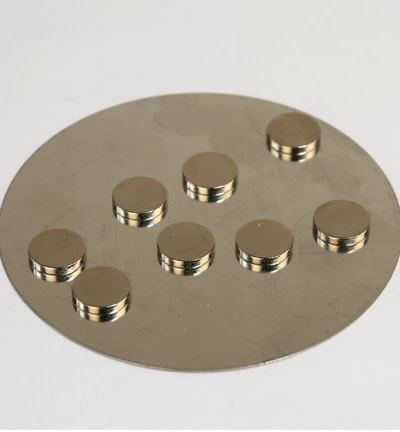 Acht sterke ronde magneten op een metalen plaat.