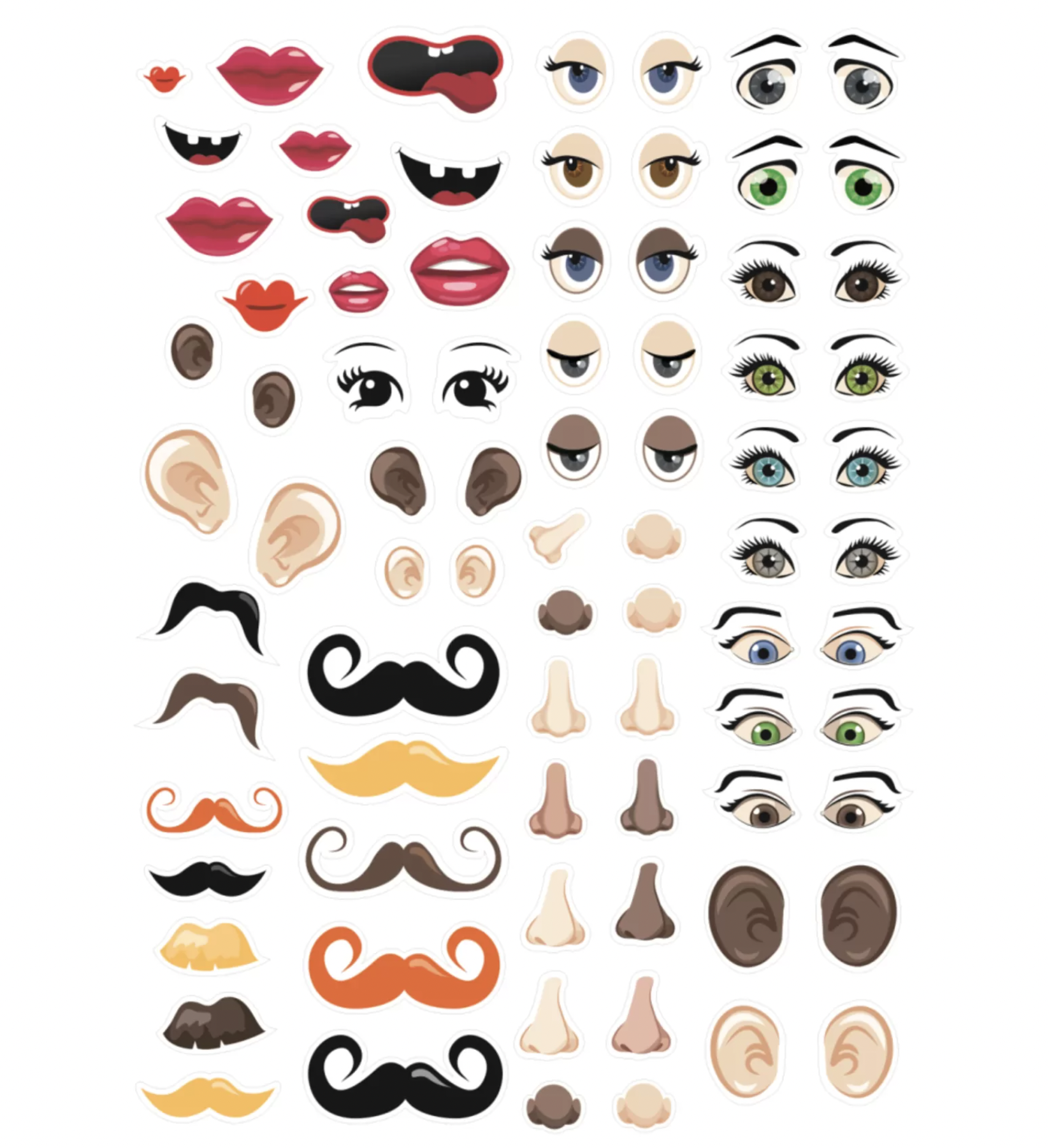 Set van twee stickervellen met ogen, monden, neuzen, snorren, oren en meer met zo'n 124 stickers.